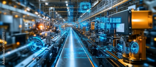 digital, twin, manufacturing, assembly, line, holographic, real, time, datum, performance, blue, line, monitoring, optimization, production, technology, connection, synchronization, precision, network, distortion, anomaly, aesthetic, pixelated, corruption, glitch, art, panorama, wide, banner, title, landscape, horizontal, hero, background, desktop, wallpaper