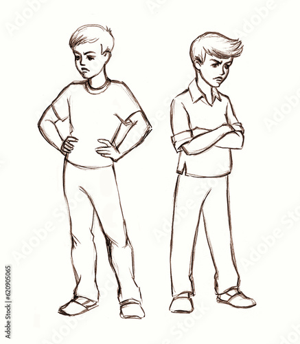 angry, annoyed, argue, argument, boy, brother, character, children, childhood, classmate, conflict, confrontation, conversation, dialogue, difficult, disagree, disagreement, negotiate, challenged, drawing, emotion, expression, friends, friendship, graphic, human, illustration, irritated, isolated, children, mood, negative, offend, person, problem, quarrel, relation, human relationships, rancor, school, schoolboy, sibling, stubborn, student, teenage, teenage, unhappy