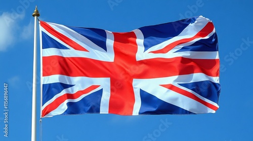 The Union Jack, symbolic of the United Kingdom, waves vibrantly against a clear blue sky, portraying national pride, identity, and the spirit of Britain.