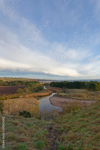 The view from Red Castle of the Lunan River and the countryside behind Lunan Bay, on a cold December Morning.