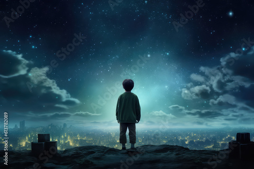 The view from the back is of a boy looking at night city and a beautiful starry night sky with lots of bright flashes. A creative concept of imagination, a child dream. Generative AI illustration.