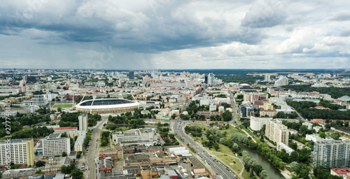 The view of the city of Minsk. Belarus. The storm clouds, the stadium and the city. Photos from the drone.