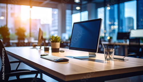 office, morning, sunshine, brilliant, computer, flowerpot, keyboard, blank screen, modern, job, company, work, day, start, monitor, business, interior, laptop, desktop, mouse, empty, indoor