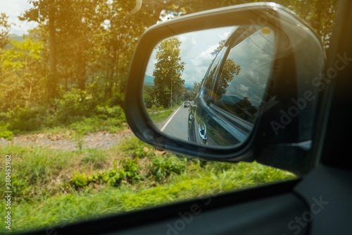 The view through the side mirrors of the car, Driving on vacation through the national park.