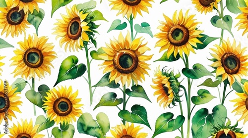 The watercolor illustration showcases vibrant sunflowers and green leaves on a white background, capturing their natural growth and movement in a realistic yet artistic style.