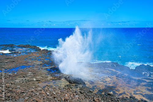 The waves lap the reefs on the shore, stirring up the white waves. A view of the seashore in Hawaii, USA. June 2019.