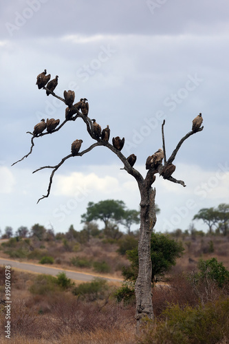 The white-backed vulture (Gyps africanus) flock sitting on a tree. A tree by the road full of African vultures.