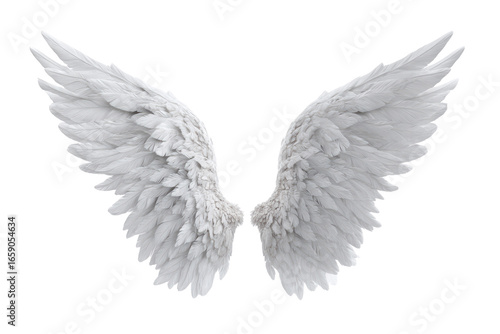 The wings of a white angel are shown in full view. The wings are large and spread out, giving the impression of freedom and grace. Concept of peace and serenity