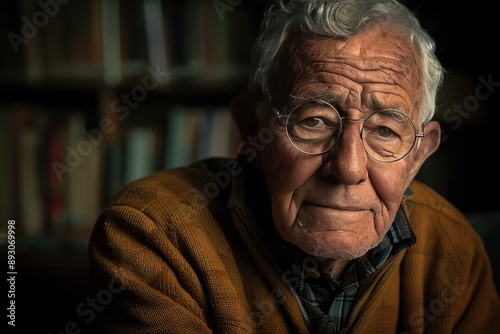 The Wisdom of Age - Portrait of an Elderly Man with Silver Hair and Round Spectacles in a Serene Library Setting
