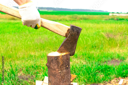 The wood chopper sticks out in wooden hemp. Ax and ax handle. Man's , male hands in white colors gloves holding an axe.