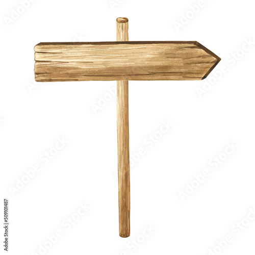 The wooden pointer is painted in watercolor. Wooden signboard for copying space. Textured wood background with watercolor hand-painted.