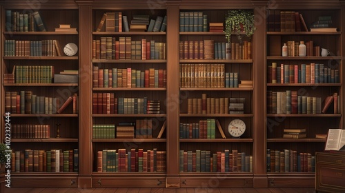 bookshelf, wooden, shelf, textbook, academic, literature, study, cosy, book, library, education, reading, cognition, home, office, decor, warm, tone, furniture, classic, style, organisation, resource, research, scholarly, antique, green, plant, clock, modern, workspace, arrangement, literary, information, learning, interior, design, ambience, collection, reference, volume, generative, ai