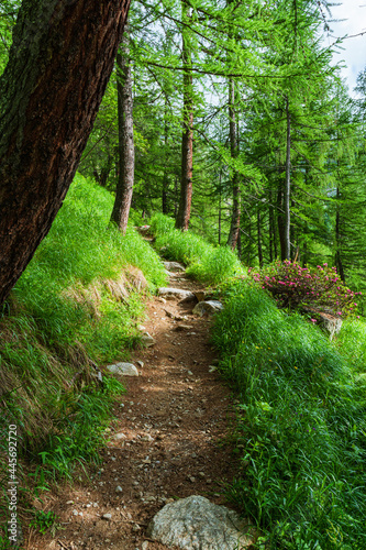 The woods, meadows, pastures and glaciers of Monte Rosa during a summer day, near the town of Macugnaga, Italy - July 2021.
