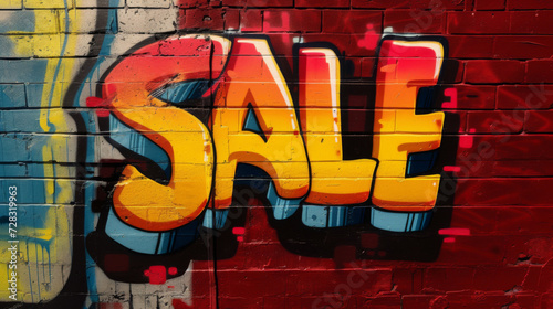 The word Sale is written on the wall in graffiti style. Spray paint street art discount.