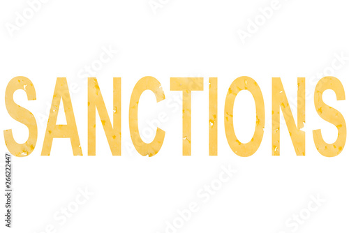 the word "Sanctions" from cheese with holes, on a white isolated background, a symbol of prohibition and delicacy