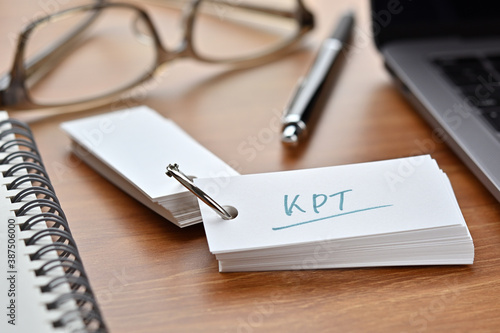 The words "KPT" written in a word book with laptop PC and a pen. It is an acronym for "Keep, Problem, Try".
