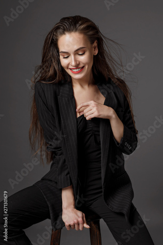 The young female laughs and looks down. A sexy young woman in a business black suit is sitting on a chair. A girl with long black wet hair reacts emotionally. Portrait of a person in the studio