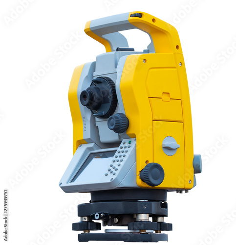 Theodolite on a white background, measuring the coordinates and level values ​​on the Earth's surface