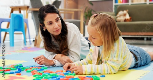 Therapist, child and letters toys in office for mental health, examination or progress. Psychologist woman, pediatrics and girl for wellness, clinic or consultation for patient support or development