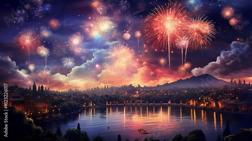 fireworks, celebration, fireworks, night, holiday, romantic, sky, explosion, festival, fire, party, light, new, display, celebrate, black, pyrotechnic, red, colourful, event, blue, year, new year, july, explode, dark, city, water, river, bright