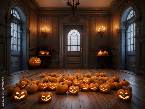 There are pumpkins and jack-o-lanterns on the floor in front of a doorway, scary magical background, Halloween atmosphere, Halloween scene, haunted background, magic doorway, spooky and frigh atmosphe