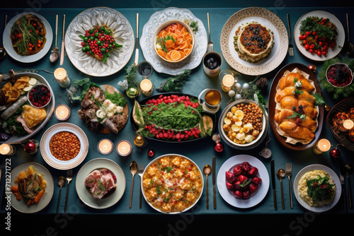There is a variety of food on the table. View from above. Table setting. A festive lunch or dinner.