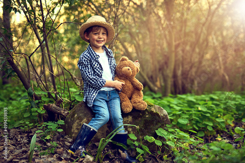 Theres no better companion in the woods. Shot of a little boy sitting in the forest with his teddy bear.