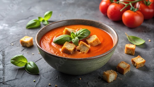 Thick and creamy tomato soup in a gray ceramic bowl garnished with a sprig of basil and crusty bread croutons on the side