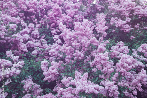 Thick clusters of blooming purple lilac flowers on bushes. Outdoor nature photography