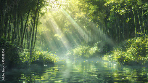 Thie bamboo forest with river and sun beams