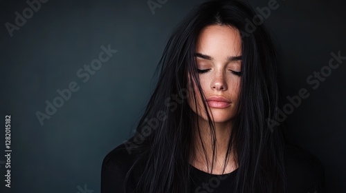This artistic portrait features a woman with wet dark hair and a contemplative expression, surrounded by shadows, evoking a deep sense of mystery and emotional resonance in art.