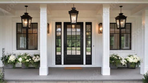 modern, farmhouse, entrance, aluminium, door, black, glasses, exterior, design, hanging, lantern, contemporary, wood, accent, white, wall, stylish, welcoming, home, decor, architectural, architecture, landscaping, suppressing, attracted, front, residential, entranceway, lighting, space, symmetry, decorative, clean, line, minimalist, inviting, rustic, charme, element, facades, natural, light, improvement, detail