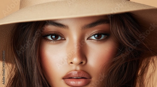 This close-up captures a woman's expressive eyes, framed by soft waves under a beige hat, displaying an enchanting blend of warmth and mystery.