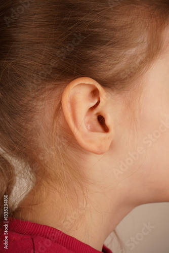 This close-up focuses on the girl's ear, capturing the fine details of her auditory structure. The image offers a unique perspective, highlighting the elegant shape and texture of the ear.