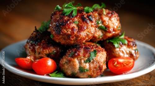This close-up image features grilled meatballs garnished with fresh parsley and cherry tomatoes, showcasing an appetizing presentation ideal for a hearty meal.