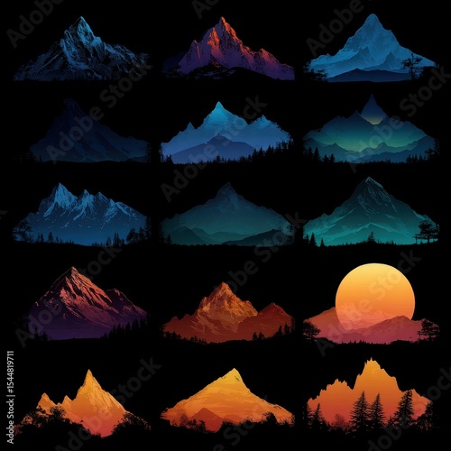 This collection showcases a set of vector mountain shapes with vibrant gradient colors, perfect for illustrating outdoor scenes, adventure themes, and environmental designs