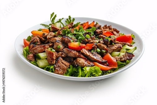 This delicious dish features cooked beef, chicken, and fried meat with fresh green vegetables, a healthy and gourmet meal