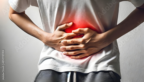 This image captures a person suffering from stomach pain due to poor health conditions. They are hunched over with their hands placed delicately on their abdomen.