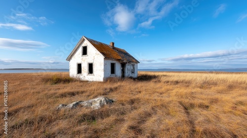 This image captures an abandoned white house standing resiliently in an open landscape, surrounded by tall golden grass, reflecting themes of decay and the passage of time.