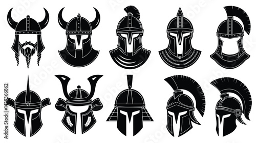 This image displays a collection of various historical warrior helmets in black and white silhouette