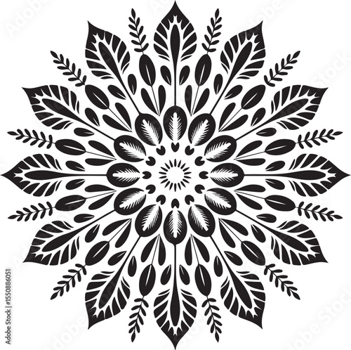 mandala, floral, intricate, detailed, pattern, symmetric, black-and-white, line art, illustration, vector, decorative, ornamental, spiritual, meditation, flower, leaf