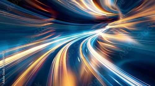 This image features a dynamic abstract pattern with swirling light in radiant colors of blue and orange, creating a vivid sense of motion and energy.