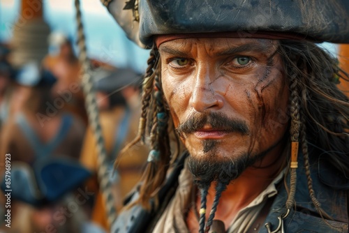 This image features a man dressed in pirate attire, with an intense expression, captured on a ship, evoking a sense of adventure and historical exploration.