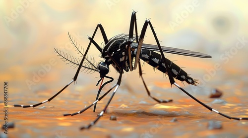 This image features a mosquito in profile rendered with remarkable detail, highlighting the fine structure of its body and limbs against a subtly colored background.
