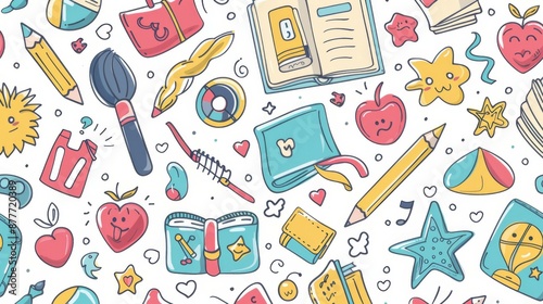 This image features a seamless pattern of various school supplies scattered on a white background, including books, pencils, and whimsical shapes, suggesting a creative learning atmosphere.