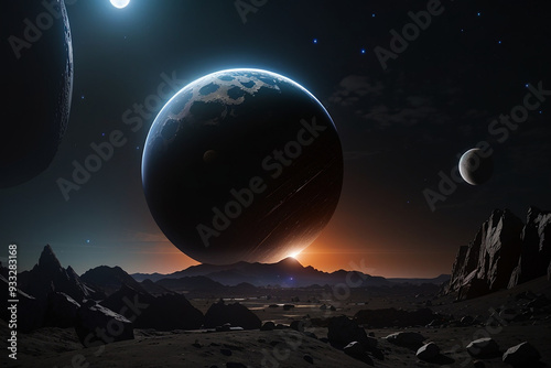 This image shows a planet with a large moon, a smaller moon, and a distant star. There are rocky mountains in the foreground.