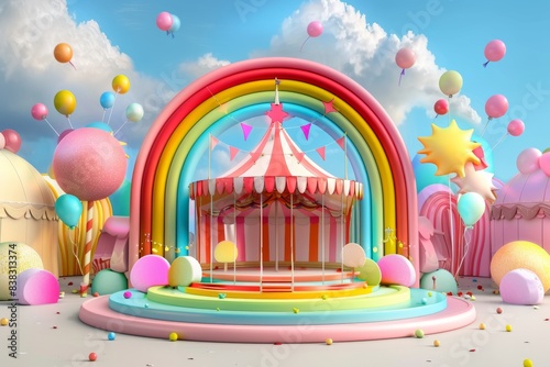 amusement, carnival, fantasy, funfair, rainbow, three-dimensional, background, carousel, circus, tent, festival, entertainment, concept, ride, abstract, design, business, hot air balloon, style, craft, magic, fun, playground, sky, train, ferris wheel, origami, illustration, cartoon, leisure, luna park, generative, ai, summer