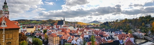 This is an ultra-wide, panoramic shot of one of the most beautiful medieval towns in Europe: historic Cesky Krumlov in the Czech Republic.