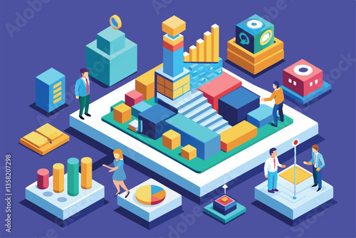 This isometric illustration features professionals analyzing data using graphs, charts, and blocks, Visual data Customizable Isometric Illustration