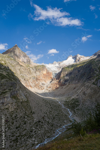 This landscape photo was taken in Europe, Italy, Aosta Valley, in summer. It shows the Pre de Bar glacier and Mount Dolent, under the sun.